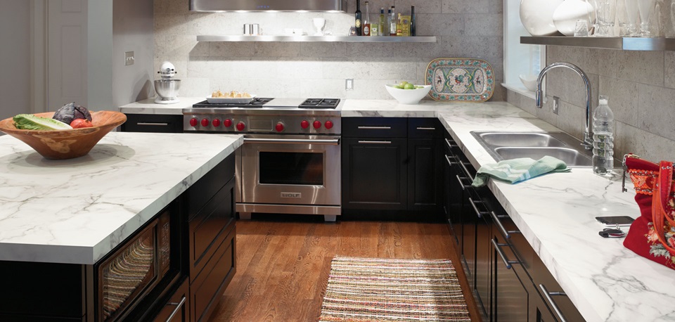 Formica 180fx and arborite laminate countertops give the look of soapstone and marble.